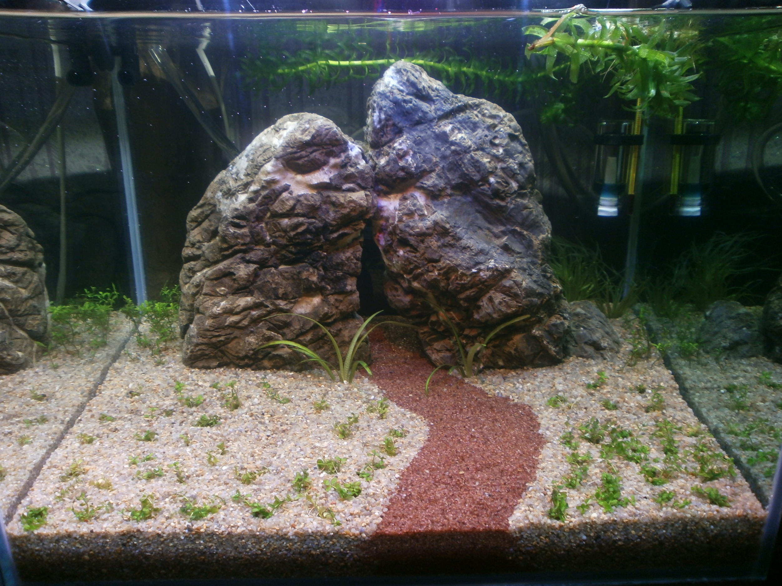 Почалось все із знахідки в загашниках кусків скла 5мм.Руки зачесались,зроблю думаю відсадник,давно хотів спопробувати склеїти акву. Акваріум вийшов не АДА звісно,зате своїми руками,і навіть за 3 суток не потік)).Це був перший поштовх. Другим став,випадково впавший в око славнозвісний Resun MICRA CY-20,купуючи корм побачив завалену іншою продукцією коробку,де виднівся надпис CY-20,в голові промайнула думка що знайомий надпис,попросив продавця показати коробку(вже запилену),ну а там даний фільтр,побачивши мою зацікавленість продавець одразу видав "за 200 віддам"(мабуть він там давно вже пилився  ),звісно такий момент не було втрачено. Після покупки фільтра в голові вже крутилась картинка криветочника а не відсадника. Замовив грунт та каміння,і на цему бюджет і час було суттєво зрізано,так як майже на Новий рік став батьком,і на місяць все зупинилось. Ну а кілька днів назад натрапив на потрібні рослини,з приємною ціною,і все закрутилось знову). Чимось подібним раніше не займався,тай людина я не творча,вже рік як запустив 100л "болото",на якому вчився так би мовити,так що прошу сильно не придиратись до моєї "творчості")). Імітацію річки не хотів робити білим піском,у всіх так,захотілось чогось іншого)). Що вийде побачу коли Мікрантемум Монте Карло розростеться(ЯКЩО розростеться,почвопокровки ще не тримав). Ну і пару фото(дзеркалки не маю нажаль,а мильничка видає фото не дуже,так що заздалегідь вибачаюсь за якість),останні 2а фото сьогодні після підміни,а запустився 10.02.17. Рослини (монте карло та блікса) нажаль прийшли трішки примерзлі,надіюсь відійдут,і блікса і монте карло на сьогодні коли вмикав світло трохи пускали повітря(сподіваюсь не останні вздохи  ). Критиці та підказкам буду тільки радий