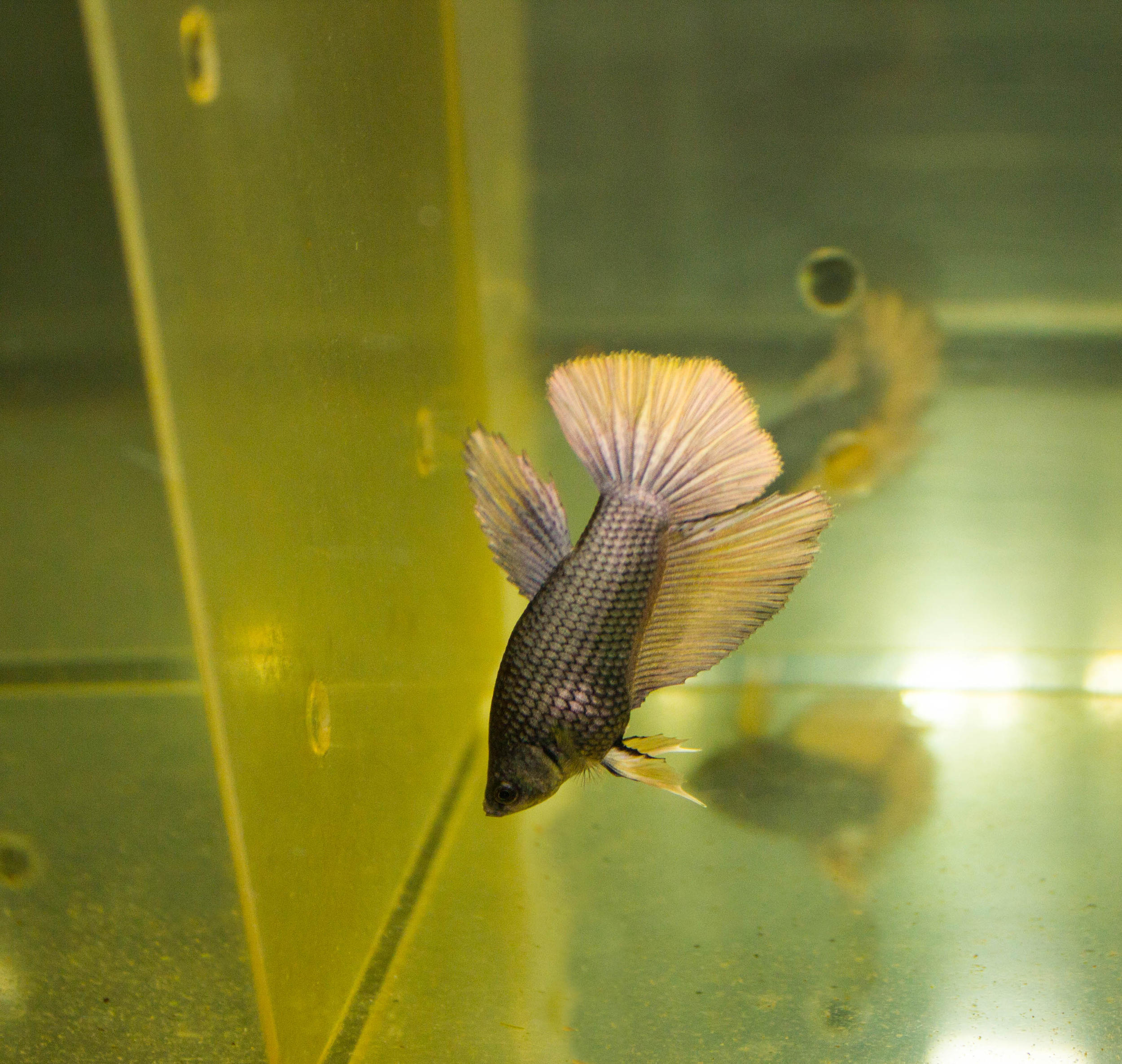 размеры 30*20*25 см, слой воды 15 см, температура 28 град., растения, коряжка, гнездо под листом Ketapang