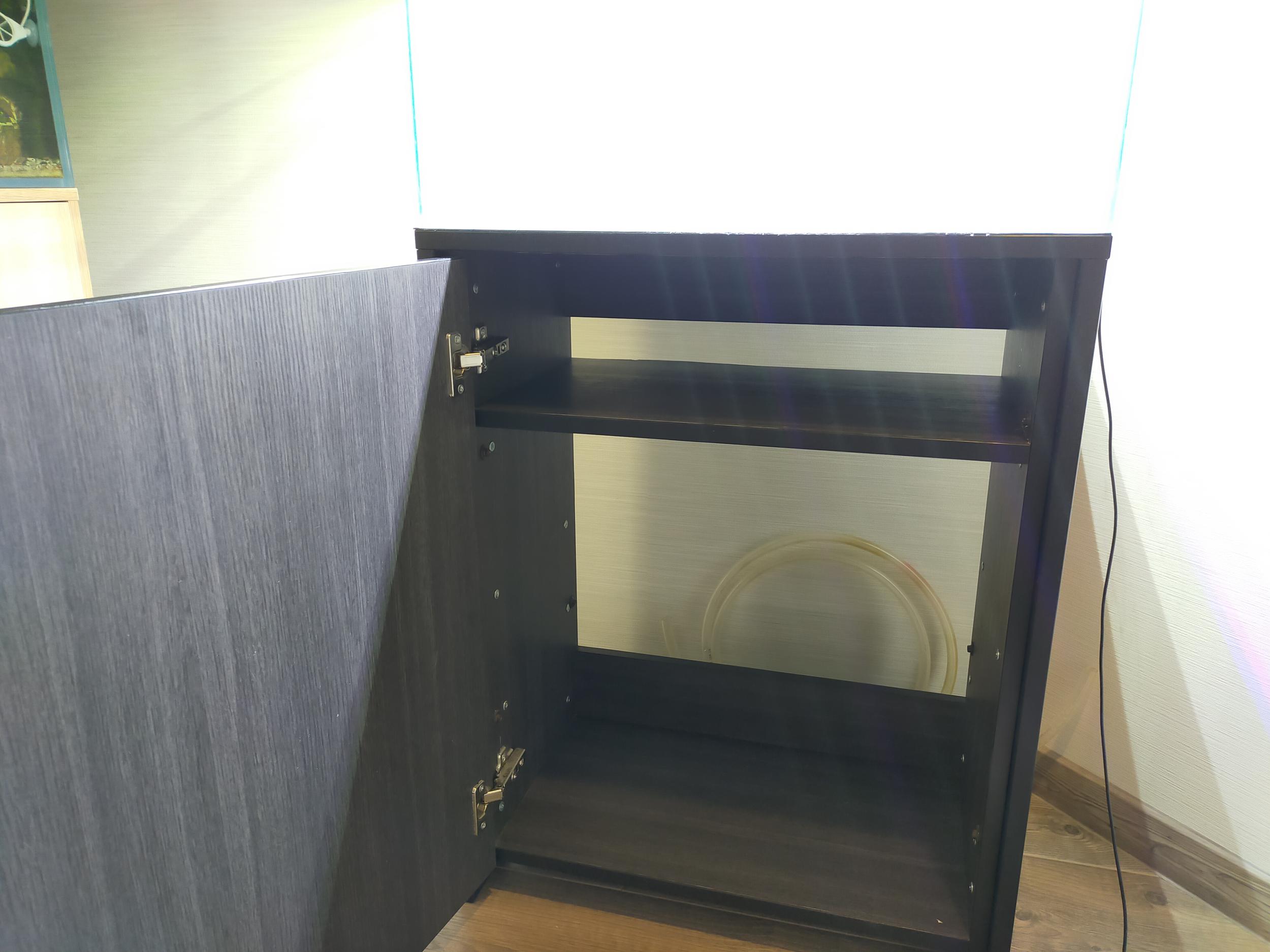 Акваріум+тумба. Акваріум 60*35*35 см. Тумба висотою 77 см. Тумбу додатково укріпив саморізами. Полиця знімається. В тумбу влазить балон на 2 літри. В одному кутку трошки здулась від вологи, але то не критично, коврик під акваріумом це компенсує. Шви акваріума місцями виглядають не дуже гарно, але склеєно надійно. Є кілька дрібних непомітних подряпин на передньому склі. І трохи помітна подряпина на боковій стінці ближче до дна.