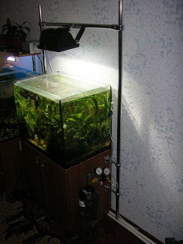 Светильник на основе металл труб. Мощность 150Вт. ПРА вынесена в отдельный блок от блока питания компьютера. Там же стоит блок питания на 6 вольт, который используется для вентилятора охлаждения ПРА!!!!!!!!. Этот же блок питания на 6 Вольт можно использовать и для э/м клапана подачи СО2!!!!!! Сам клапан я не использую, все никак руки не доходят до ума довести))))). Но автомобильный клапан подключал- работает на ура, 6 вольт достаточно и для пуска и для удержания клапана. Вся электроника может быть подключена к таймеру, т.е. включается свет и включается клапан (если вы его конечно будете ставить). Сама верхняя балка- регулируемая по высоте, так же и вертикальные трубы можно опускать выше и ниже сколько хотите. Размеры прожектора д*ш*в-260*160*130. Сама сея конструкция предназначена для аквариума и тумбы длиной 600 мм. (делал под себя). Но возможно переделать и под другие размеры. Скажете размеры- я новую трубу горизонтальную поставлю. Единственным недостатком сей кострукции считаю, что ПРА в блоке питания не закреплено, просто не к чему там было его крепить. Т.е. поставили: и не трогаете.