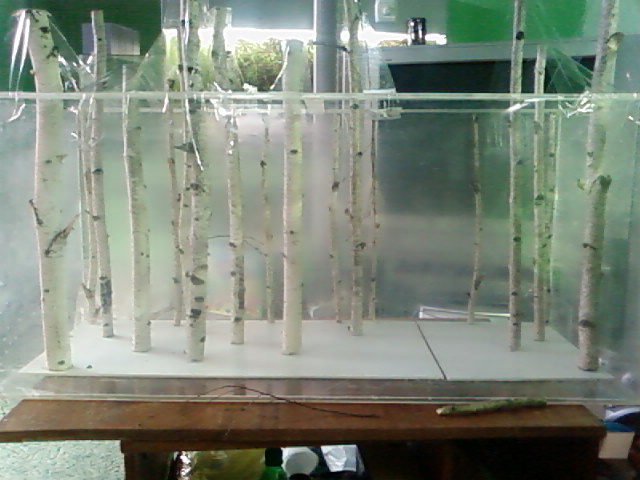 За основу брался кусок ПВХ вырезаный по площади аквариума, на котором изначально располагались подогнаные по высоте ветки.В дельнейше отметки каждого "дерева" и места расположения.Закрепление с низу саморезами.Готовая кострукция вставляеться в аквариум после чего залаживаються камни и грунт.