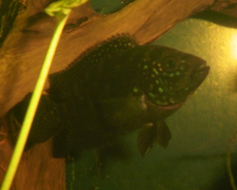 я придержываюсь мненыя что ёто акара,голубовато-пятнистая,возможно и бирюзовая,только размер смущаёт,риба ужасно затянутая...
