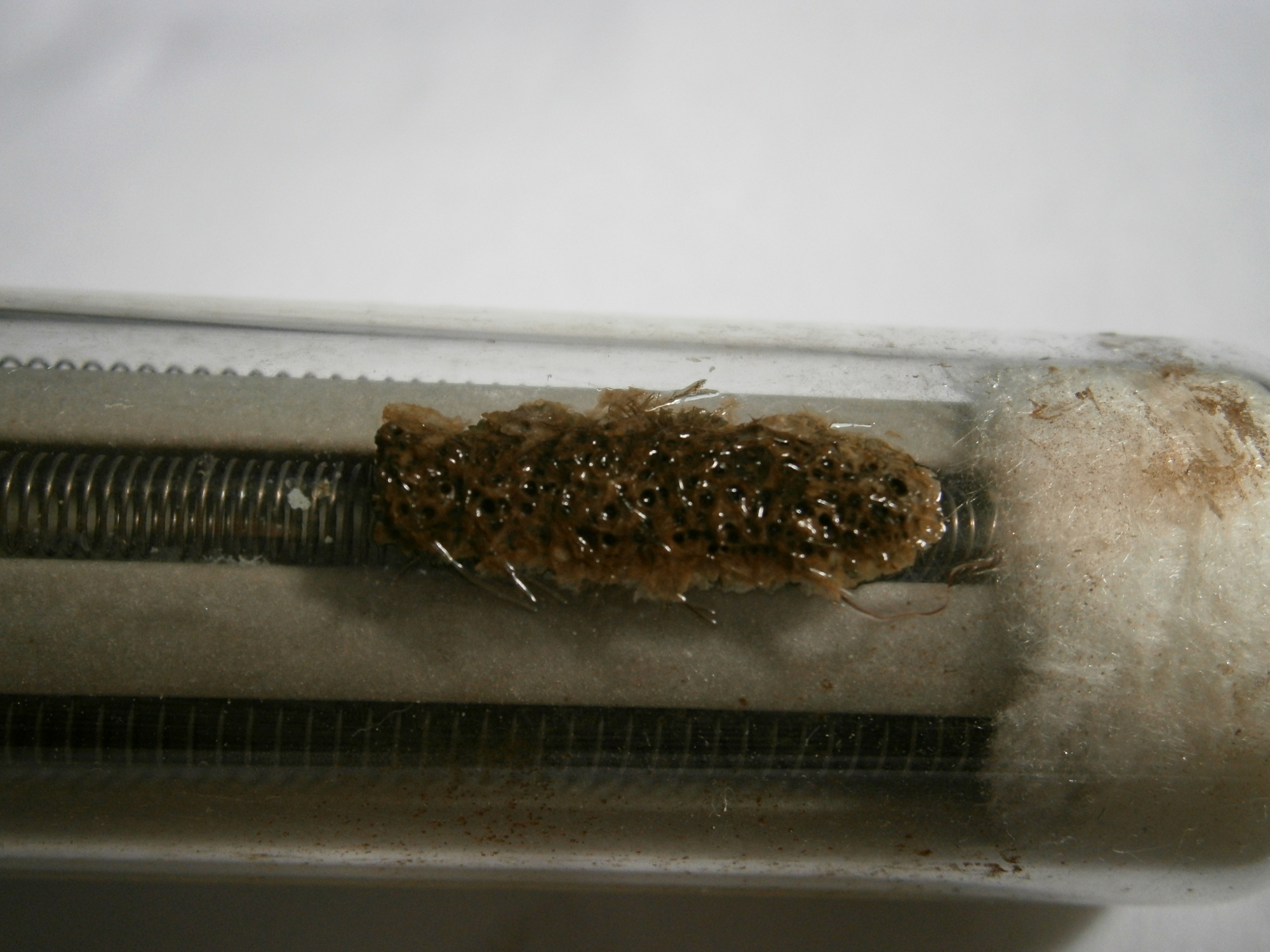 Нагреватель вынимаю уже выключенный (у меня их пять) и сразу мою под краном - рукой же сразу и нащупала... Хорошо ещё, что не сгорел. Такая термоизоляция от гнезда получилась на стекле - ножом счищала.