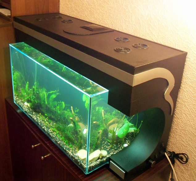 размещены навесной фильтр, куллер, блоки питания для куллера и ночной подсветки. Есть место для установки , подключения и хранения компрессора, обогревателя. Свет – два светильника по 18 ватт распложенных в виде подвижной, съемной балки. В ней же закреплена "вечерняя" светодиодная подсветка с регулировкой белого и синего