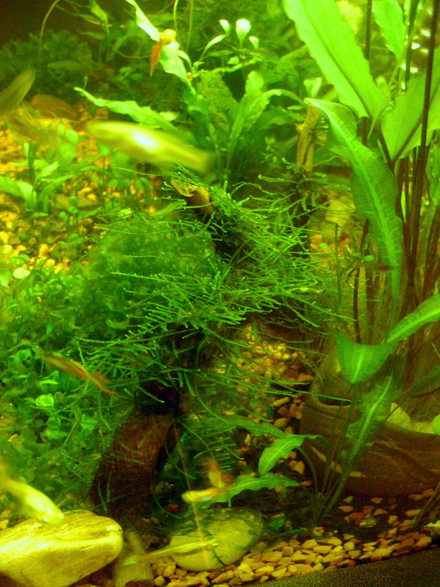 Нерестовичек-подростовик для суматранских барбусов-31*25*13=10л.Свет-красноватая экономка на 9 ватт,обогрев китаец-25ватт,компрессор Ресан,грунт -галька,растения-роголистник,рыба-мартовские мальки суматранцев.