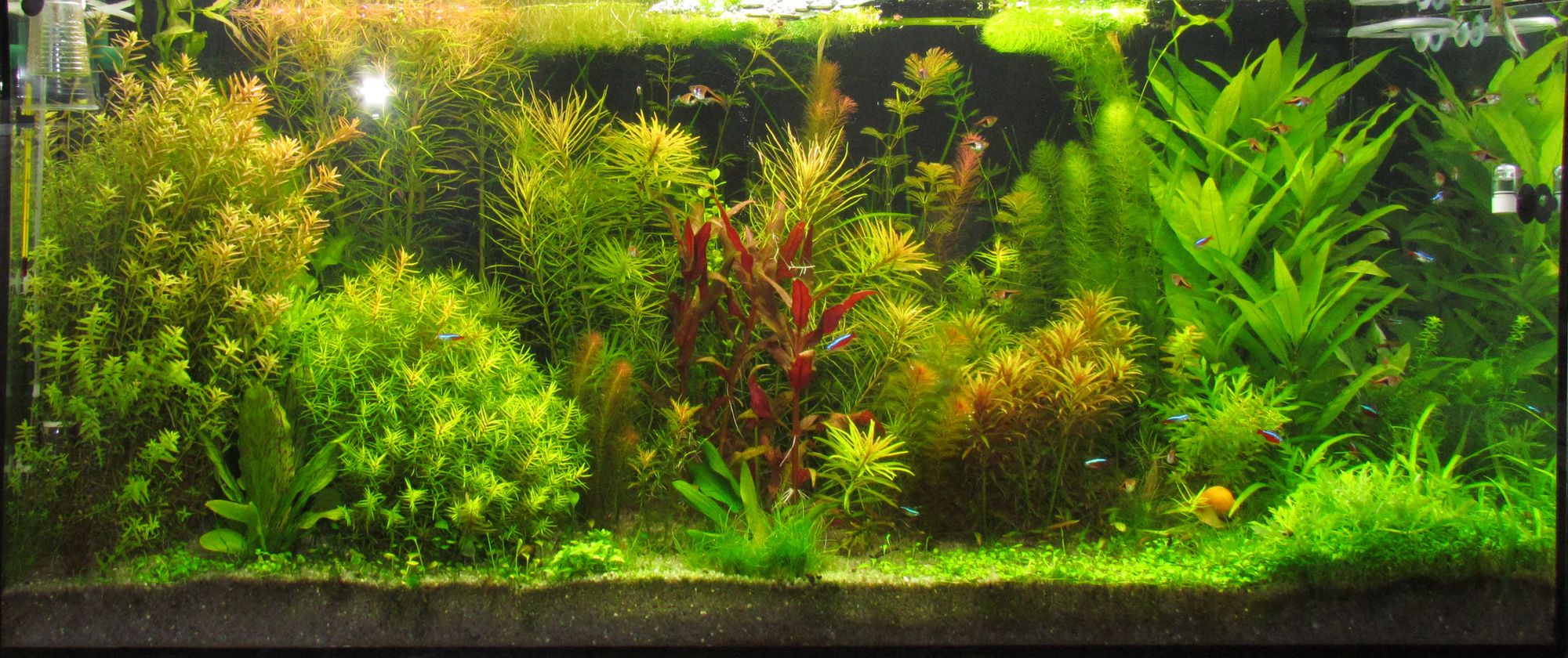 обитатели: неон голубой 7шт, барбус вишнёвый 5шт, апистограмма рамиреса 2 пары, боция мраморный 3шт, лабео биколор 1шт, анциструс 2шт, сомик крапчатый 3шт, кардинал 4шт,акантофтальмиус 7шт,много неокаридинок.