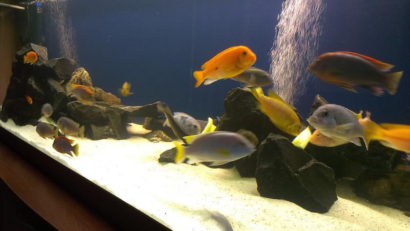 Моя баночка! Запущена неделю назад! ОБъем -760 л, банку делала Акватика, работают два ФХ6, свет - две Сильвании 150мм Аквастар + Гролюкс по 80Вт (но свет мне не нравиться, буду ставить Марине), компрессор Ейхем 400, обогревать тоже Ейхем но сейчас не в работе. Питомцы видно на фото!