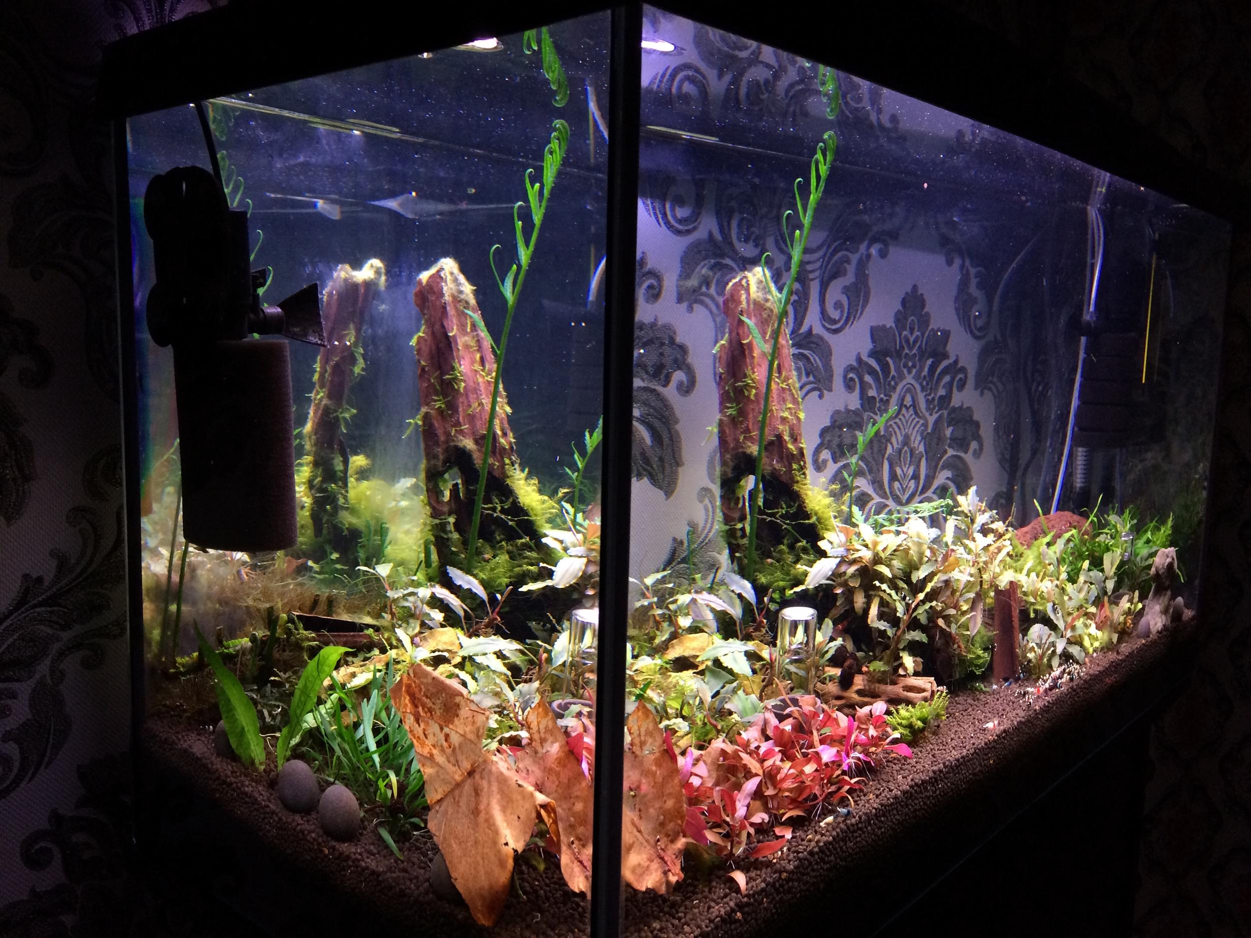 СО2(лимонка, диффузор шприц), удо, led самодельный 45 Вт (6500К+11000К+440нм+660нм), кварц, Auael Fan 1 Plus (губка не родная)