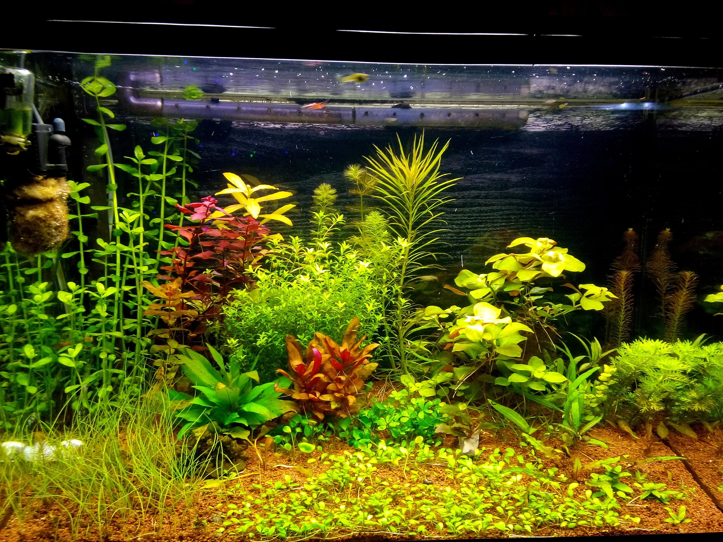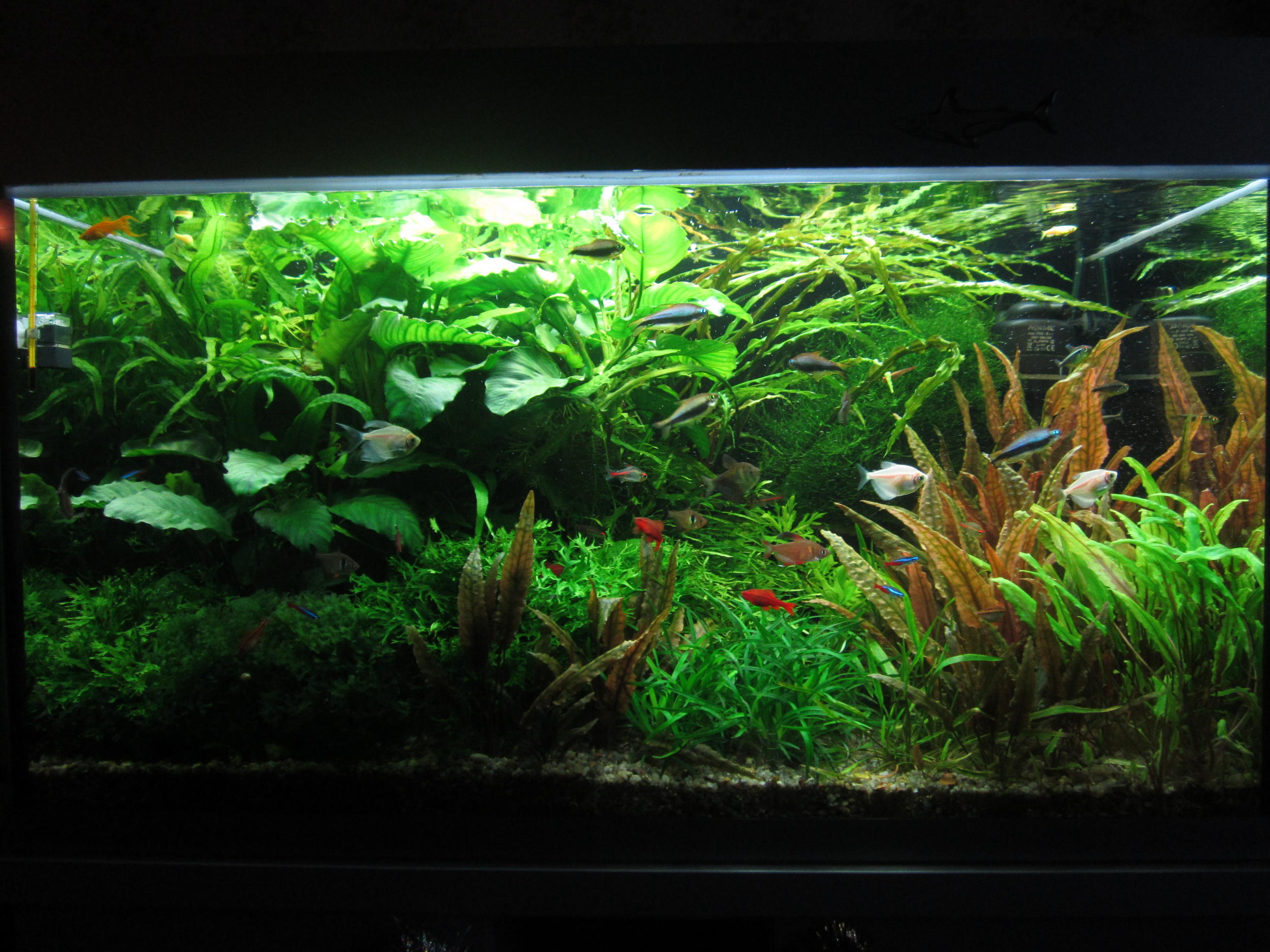 мой аквариум .общий объём 140 л.Чистой воды где-то 110-120л.Запущен в январе 2016.свет 2*Т8* 18Вт Осрам Флора +2 Аква Гло + 1 Т5Скай Вей 24Вт