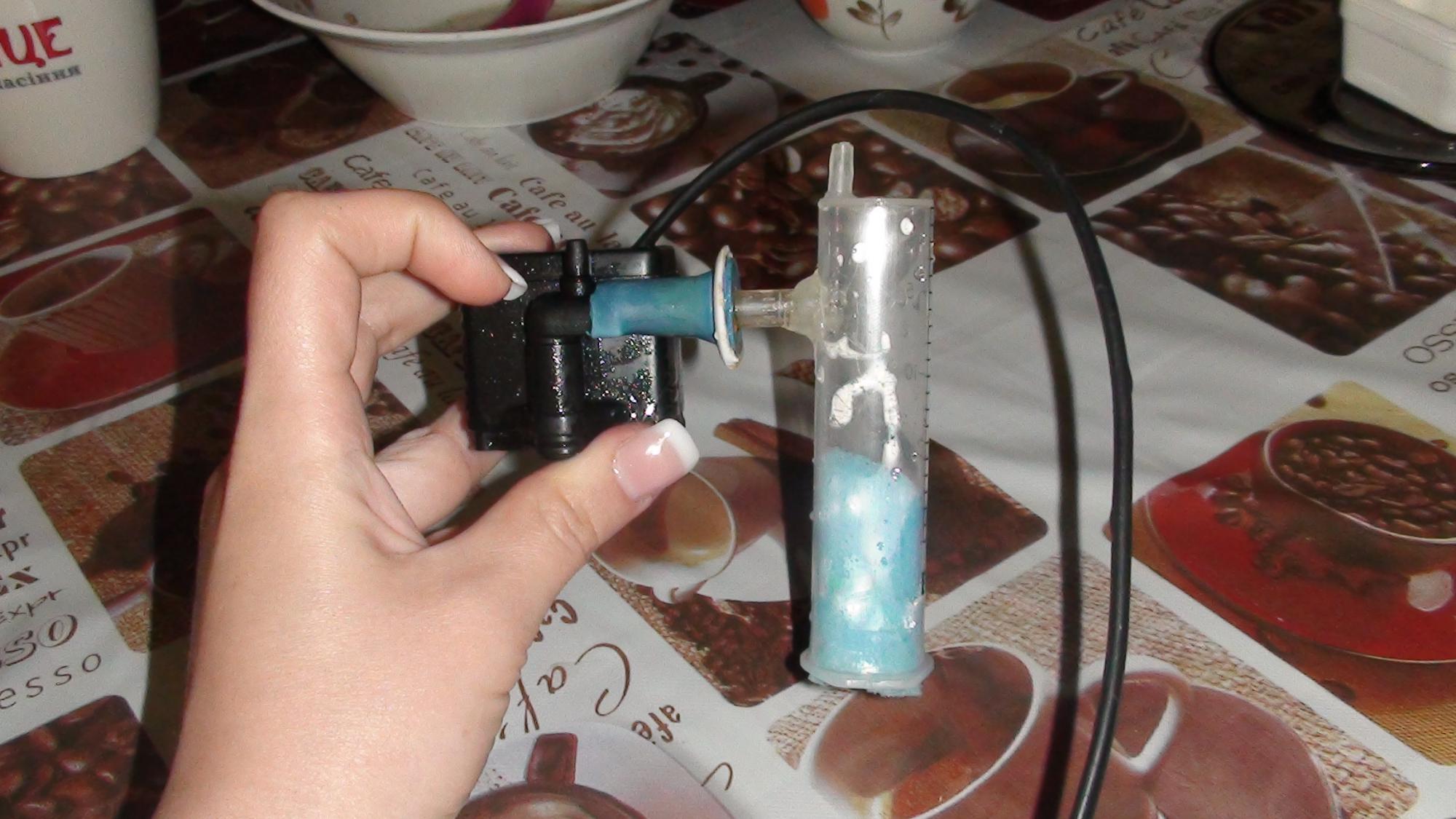 2) Берем шприц 5 мл. вытягиваем клапан и обрезаем держатель, с боку шприца сверлим отверстие для шланга