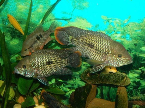 Самец стал в полтора (если не в два) раза больше самки, желтая окантовочка намного шире, плавники больше, и бирюзы много в цвете. Самочка серовата, не такая красивая, фото: