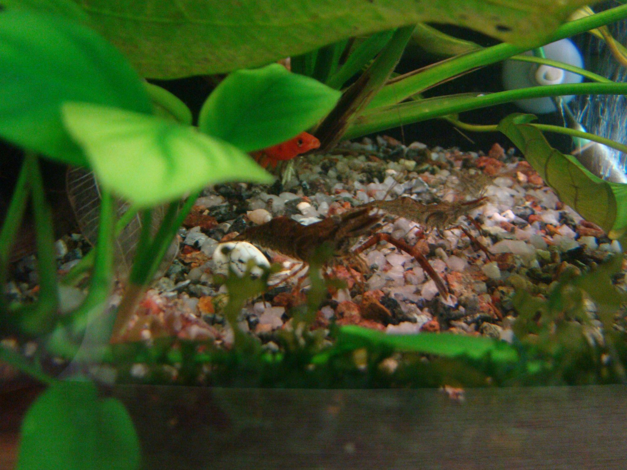 Креветки уже освоились, отогнали всех, желающих попробовать их на зуб, время от времени бегают по аквариуму