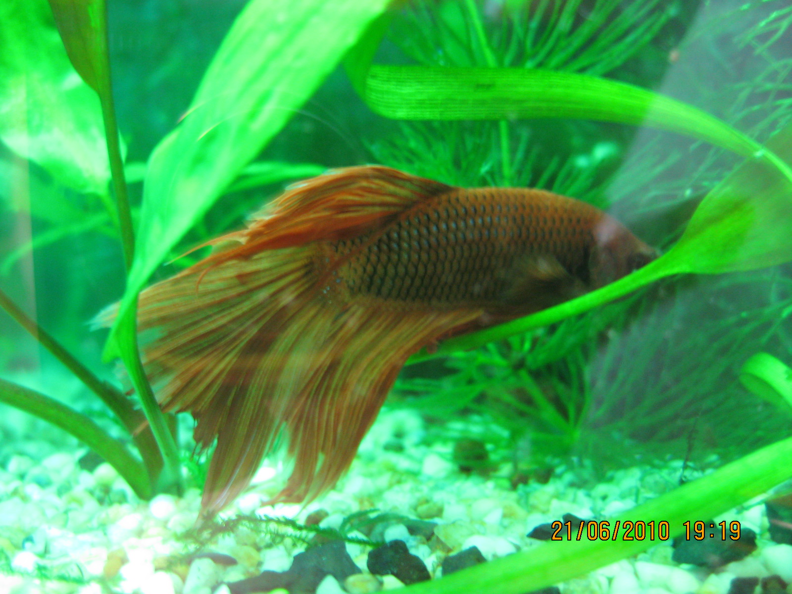 Но с одним петькой вообще получился триллер. Пришёл он в состоянии комы, вверх брюхом. Поскольку рыбу я получила поздно вечером, а данный клиент не подавал никаких признаков жизни, рука моя не поднялась вылить его в унитаз - решила до утра закинуть в баночку. На утро он уже дышал и даже перевернулся на живот (фото 7). В течение дня он даже начал всплывать глотнуть воздуха (как он дышал до этого - Бог его знает), но ни на что не реагировал. Всё это время я регулярно вертела перед его носом червячками (Сергей сказал, что дорога была долгая и мучительная - рыбы не ели почти три недели), но рыбс не реагировал. На следующий день получилось так, что червячок засунул хвостик ему в рот - и... петька его клюнул!!! Так мы стали по капелюшечке кушать. Когда петя начал пытаться плавать, я его запустила в аквариум. Наша позитивная динамика в это время выглядела так: (фото 8,9).