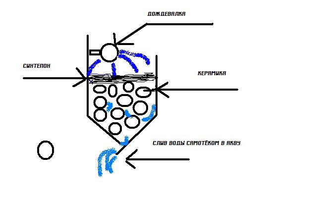 Третий снимок фильтр. В акве стоит помпа закачивает воду на верх в дождевалку в ней насверлил дополнительных отверстий под разным углом дальше синтепон а потом керамика и самотёком вода сливается назад в акву А сам насо потом закроют декарации
