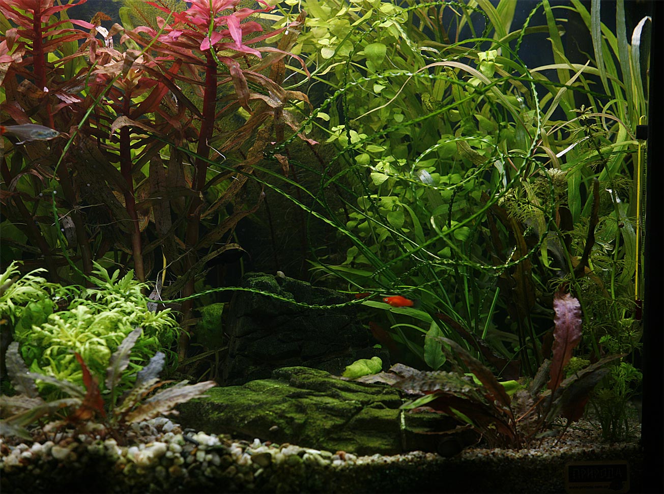 Текущее население : 10 миноров, 1 гурами, 7 попугайчиков, 1 гиринохейлус.