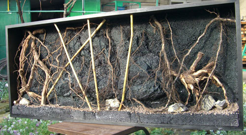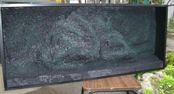 3. Третий вариант - наиболее естественный, но и самый дорогой. Это когда покупаются (или изготавливаются) панели имитирующие камни и коряги, а потом все это помещается во внутрь аквариума, вплотную к задней стенке. Такой фон действительно выглядит очень красиво, но имеет свои серьезные недостатки. "Съедается" внутренний обьем аквариума. Если фон плохо прилегает к заднему стеклу, за таким фоном собирается грязь и вытащить ее оттуда не так просто, да и чистить такой фон (ввиду рельефности) тоже не просто.
