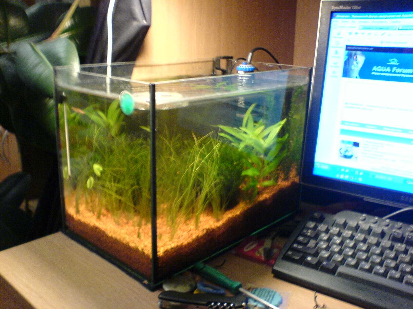 У меня 20 л. грунт 2-3 см. теннисит, фильтр Аквайэль Фан-Мини Плюс, грелка 25Ват Ягер, свет настольная лампа на прищепке в нее вкручена лампа накаливания Филипс 60 Ватт, из растючки: Элодея, Лимонник, к коряжке примотан Яванский мох и Моноселениум, Элеохарис (но он пока не растет), из живности, Катушки, Нокардины штук 10 а может не 10 но посчитать их не реально, и два Килли.