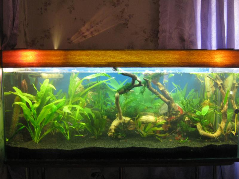 Наверное правильней было назвать тему-работа над ошибками..Сказать что побудило меня делать перезапуск 250 литрового аквариума для меня не составляет труда.В первую очередь общее состояние банки после летнего сезона,когда подменами водой из под крана,свел весь травник на нет.Проблемная у нас в Миргороде водичка.Вторая проблема была в грунте,при перезапуске пять лет назад сэкономил на покупке нормального.Купил 10кг. на верх,а на низ чего только не пошло,и керамзит и мелкая морская галька.В конечном итоге все смешалось и к чему привело объяснять не буду,кто с опытом тот поймет.Ну и третья проблемка, полный компот по рыбкам.После спуска на зиму 4 банок,большая часть рыбок разошлась,а остальную пришлось до лучших времен распихать по оставшимся.Ну и конечно повлияло впечатления после регистрации на форуме-чего греха таить.Одним словом месяц назад понял что созрел.За это время были закуплены необходимые материалы и проведена попутная работа.Вот и долгожданный день 13 ноября,Из дому всех спровадил от греха подальше и...Понеслась душа в рай.  Разгрузив и хорошо вымыв слабым раствором соляной кислоты аквас приступил к созданию своего видения биотипа Амазонки.С левой стороны приклеил вертикально "бревнышко",в права установил распылитель СО2.Первоначально на дно засыпал уголь березы(жаль больше не достал).Потом в ход пошел питательный грунт в количестве 5кг.(купил по форуму).Залил отобранным илом из старой закладки.  Свеху положил по размерам строительную сетку и засыпал приобретенной в Ароване гранитной черной крошкой фракцией 2-3мм.в количестве 40кг.(мыл часа 2,но за такую цену,можно и помучаться).  К коряге закрепил 4 вида анубиаса и 4 попоротника,плюс мох(приобрел все благодаря опять таки форуму)  Ну а дальше дело времени.Только воды дождевой не хватило пришлось на такси по знакомым вечером помотаться,все равно литров 30 так и не хватило.буду ждать дождя.Фильтр соответственно не промытый погнал работать уже в новом аквасе.  И наконец в 10-00 работа практически завершена...Кроме ранее перечисленных растений,было высажено 5 видов Эхов,нимфея красная,3 крептокорин,2 перостолистника,людвигия рубин и т.д.От плавующих в этот раз отказался.Остался последний штрих переделать освещение,лампы будут на днях.думаю на следующие выходные осилю и это.долго эксперементировал и остановился на экономках.Напоследок-жалобы ,просьбы,предложения -в письменном виде.Р.С.Водичка еще мутноватая.Далее будет.