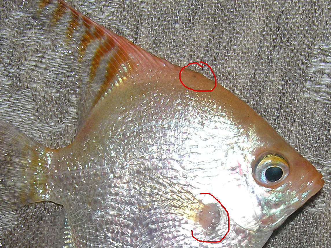 1.жемчужная скалярка,2года.основание одного бокового плавника"распушено",т.е.место между началом плавника и окружающей чешуей,как комочек ваты.на грибы,наверно,не похоже.сам плавник целый.синька не помогла. и еще. черные точки до 1мм у основания спинного,анального плавников,на жаберной крышке.некоторые видно в толще кожи,некоторые открываются наружу через небольшие дефекты.поразиты?похожие создания обнаружены на поверхности кокосовой шкарлупки(декорация в акве).