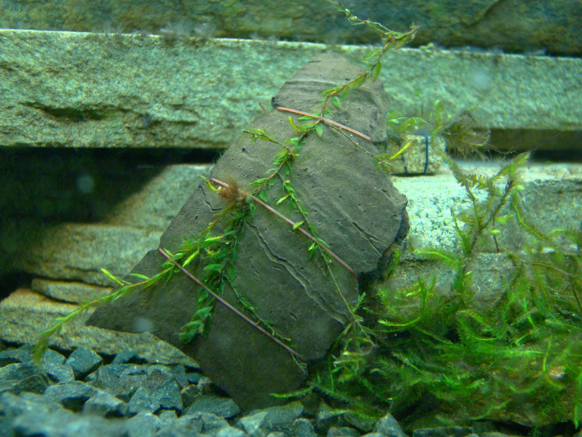 Мох был получен 31 марта,немного пострадал. Отлеживался в банке на подоконнике, отращивал новые побеги, 20.04 их я и примотала, поместив в общую акву, параметры воды не знаю, свет 0.7Вт/л.(вода в водопроводе- pH -7,5 КH -5 GH-10)