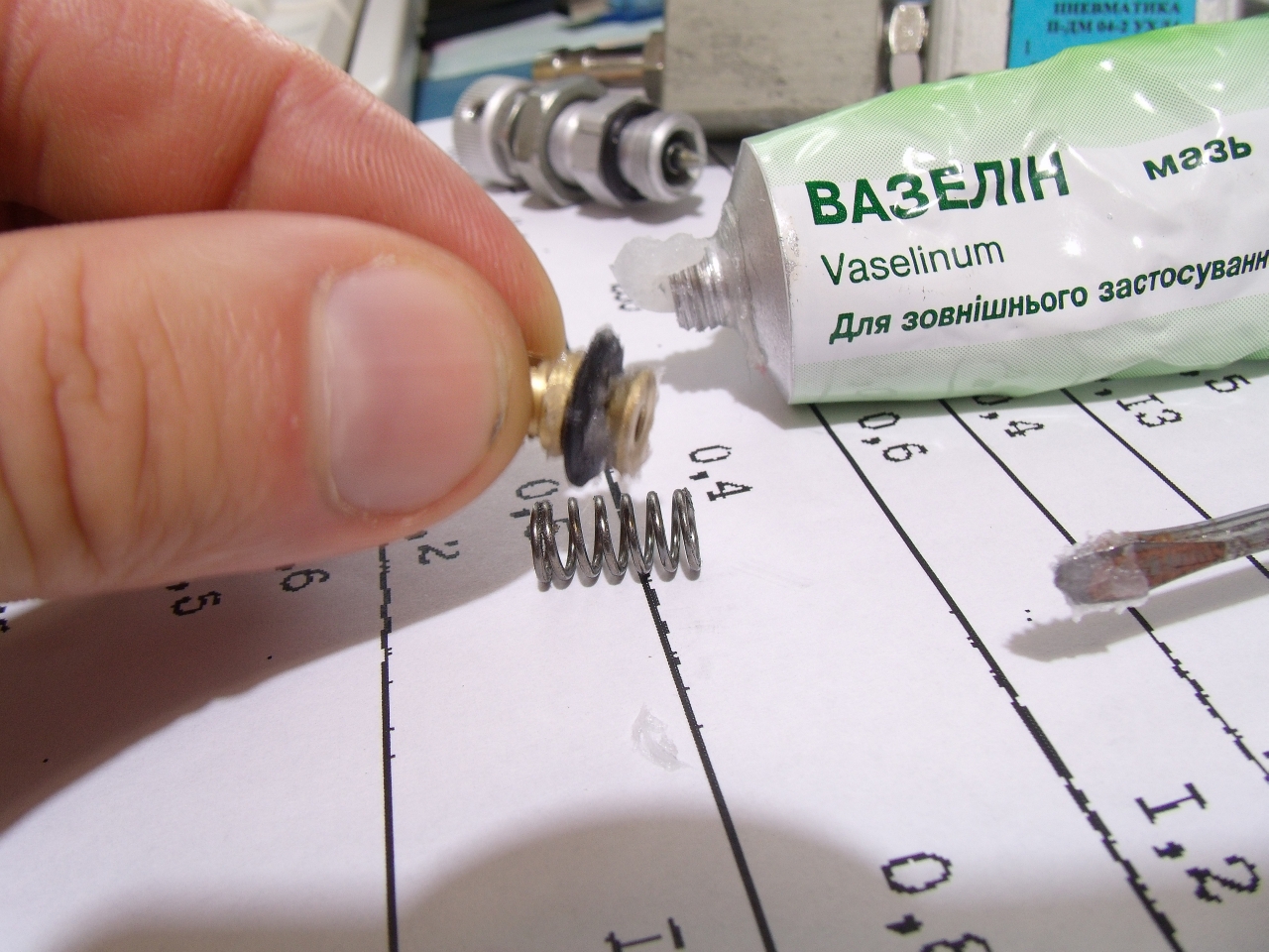Как видно из фото, смазываю вазелином. На нем хоть и написано "для наружного применения", а я его вовнутрь, вовнутрь  . Вазелин доступная, а самое главное безвредная смазка,хотя я не уверен безвреден ли он для живых организмов, но для резиновых уплотнений безвреден точно. Во время работы, пневмодросель нагреется от электроклапана, и возможно какая-то часть вазелина вытечет через выходное отверстие. Хотя у меня не вытекает.