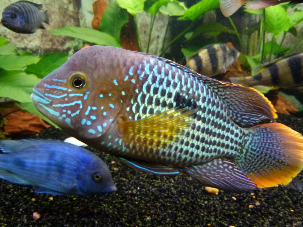Norght, ориентировочный возраст 1 год и 3-4 мес (купили в начале ноября прошлого года 10 шт в размере 2,5-3 см). Общее население менялось, сейчас в одном 120 л пара бирюзовых, пара Сальвини, брюллиха, 2 синодонтиса (19 и 14 см), еллошка, демасони, самец Седжика и самец мраморного гурами  , во втором таком же пара бирюзовых, брюль (19 см), птер (32 см), пара Меек, самка акары голубовато-пятнистой, самец голубого гурами  . Очень стараемся побыстрее сделать мебель и аквариум на 650-700 л, куда и набирали на вырост и брюллей, и бирюзовых, и птера, и Сальвини. Бирюзовые еще растут, еще 1-1,5 месяца назад самцы были 20 и 20,5 см.