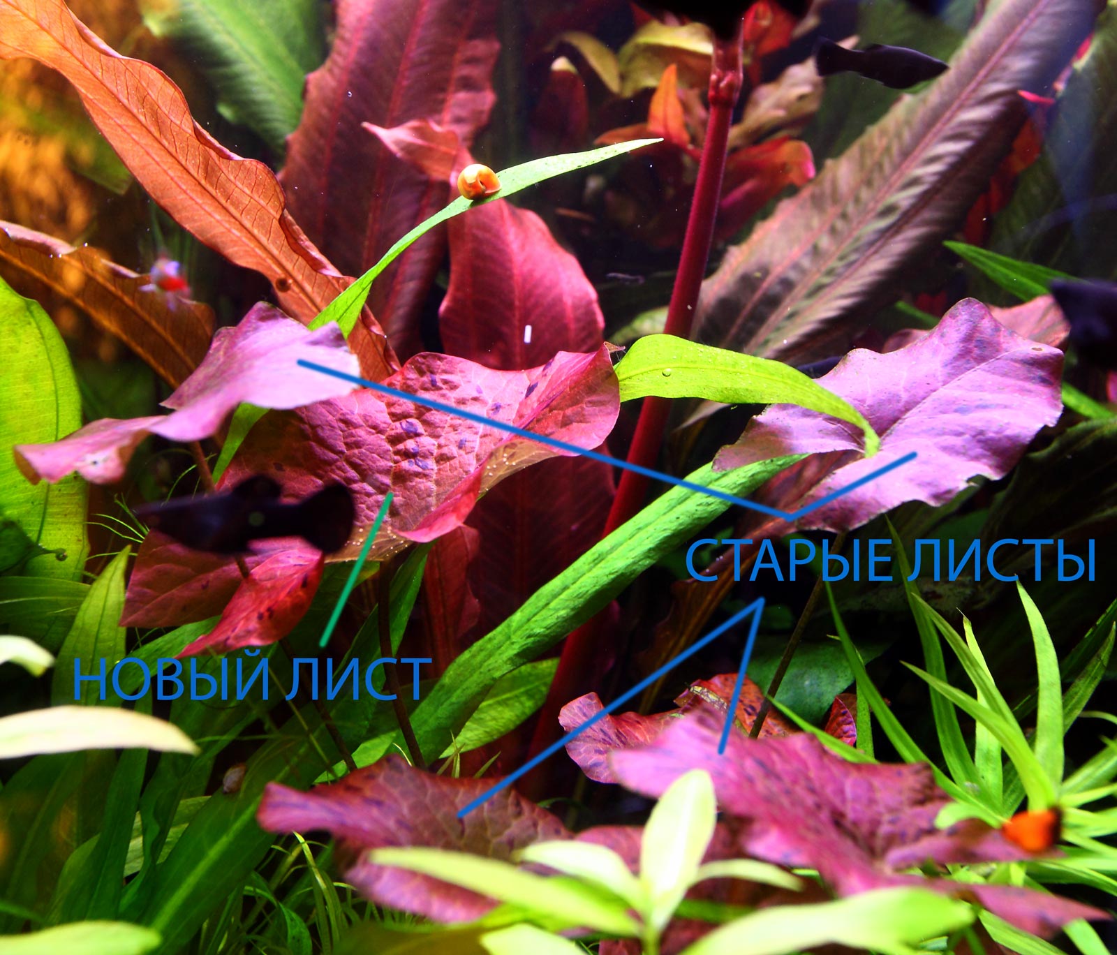 Нимфея преобразилась, новые листы пошли ярче и размером существенно больше старых. Апонагетон выбросил новые листы, в два раза больше старых, а ульвовидный вообще никак не отреагировал. Длинностебелька тормознула в росте ввысь и пошла вширь. Не заметил изменений в росте - альтернатер, эхинодорусов, криптокорин, бликсы, элеохариса..
