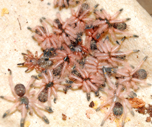 В процессе содержания один малыш был съеден собратьями (предположительно), второй погиб при линьке (скорее всего я немного прохлопал влажность). На момент осталось 5 пауков, из которых 2 определились как самцы, 3 как самки. Одна из самок безнадежно отстала по линькам, а еще одну, самую крупную я от греха подальше отсадил отдельно. Когда группа доросла до 9 линьки - самцы повылуплялись в адультов.