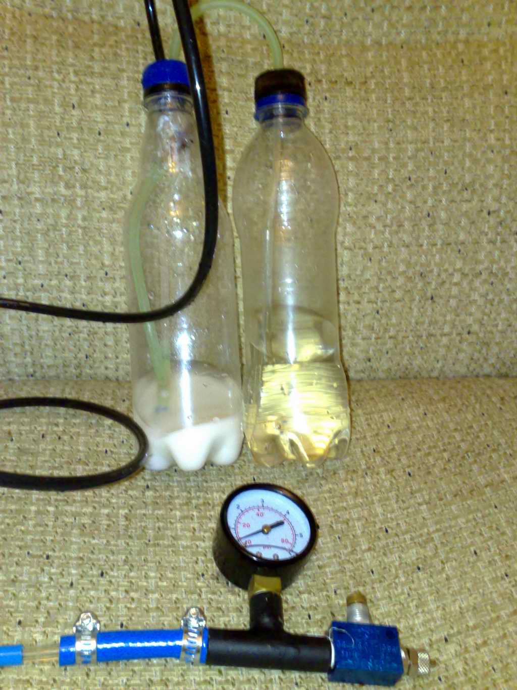 Ye_Lviv, Очень много соединений, велика вероятность утечки! Судя по показанием манометра, это еще не рабочее давление, я тоже игрался с манометром на трех разных установках, двух с клапанами и одной бесклапанной и на всех установках рабочее давления составляло 1Кпа, а на бесклапанный даже чуток больше, диффузор веточка рябины!  Но при росте давления ближе к 2Кпа, стыки не выдерживали, либо срывало шлангу либо незаметно подтравливало, причем не постоянно, а только при достижении определенного давлении, как только оно спадало утечка прекращалась, такая фантомная, неуловимая утечка!
