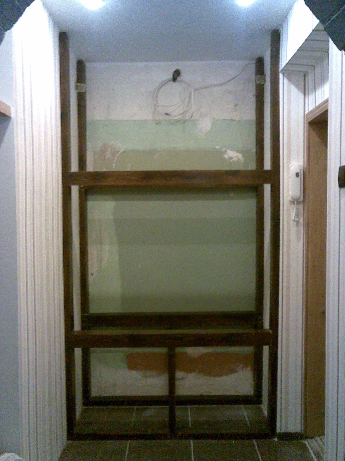 2.Затем, подумал про испарение воды в аквариуме и высокую влажность в террариуме и решил выбить дыру под вентиляцыю прямо на лесничную клетку. Вентилироватся все будет за счет так называемой вентиляционной шахты между балками. Все щели задул монтажной пеной и некоторые силиконом, чтоб нигде не фонило.