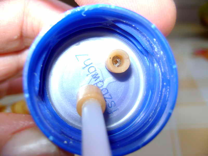 Р.S.-По рекомендациям Господина BelkinS-а можно сделать так: в крышечке от бутылки высверлить два отверстия диаметром 6мм (нужно сверлить острым сверлом и аккуратно, чтобы отверстие было с ровными краями), в них вставить шланги тоже диаметром 6мм (толстостенные компрессорные), так чтобы с внутренней стороны крышки они выходили примерно на 5 мм. И изнутри в шланги вставил белые штуцеры от капельницы. Они входят в шланги с усилием и за счет расширения шланга в этом месте, намертво загерметизировали соединение. Дополнительно ничего не проклеивал.