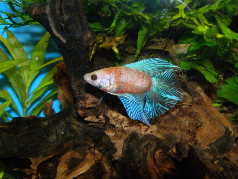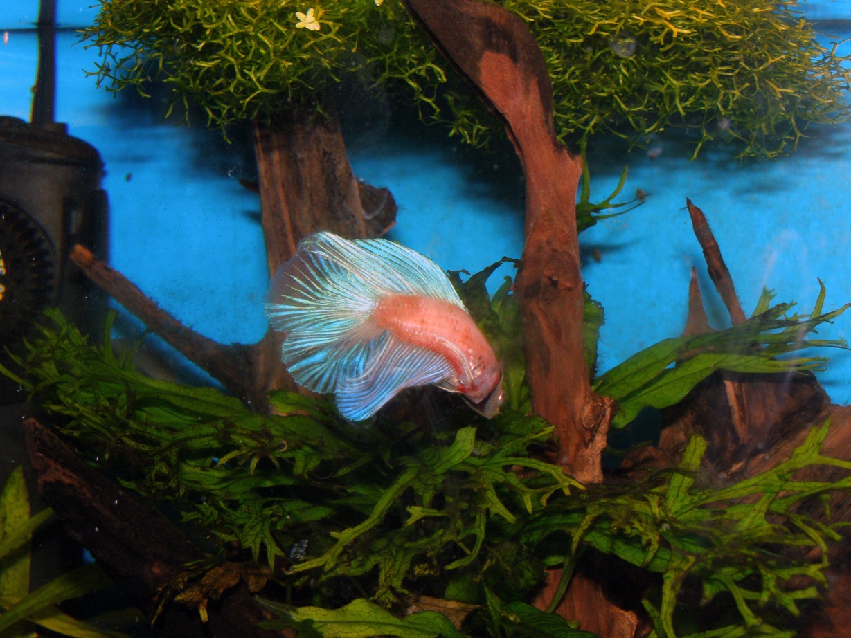 Ну вот такие фото получились, качество не очень. Кстати у петьки хвостовой плавник как бы из двух состоит, то есть это похоже на Double Tail Betta. Главное, чтобы прижился и был здоровенький. На иноземных сайтах пишут, что самку нужно попроще.