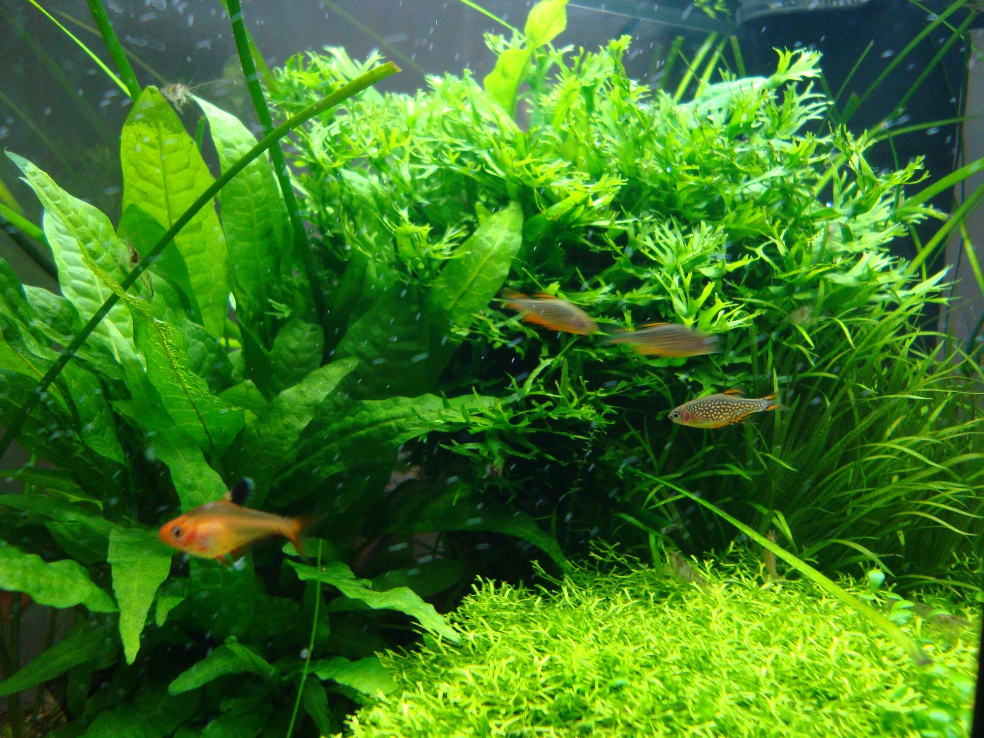 Вот мой 40 литровый растительный. Всё хоте взрастить глоссостигму и хемиантус кубу и заодно риччию к камням привязал. Всё получилось. Расборы галактика и миноры украшают почвопокровку.