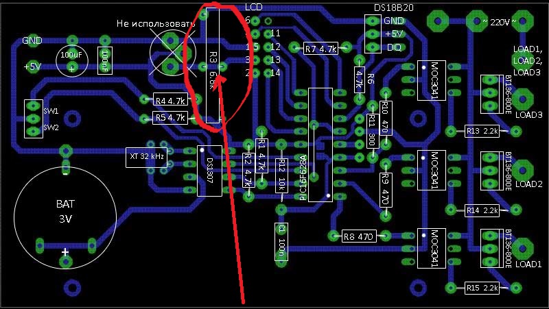 Надо запаять два постоянных резистора с приблизительным соотношением номиналов 1:20, например, верхний резистор на 470 Ом, а нижний на 10 кОм. Если изображение на LCD будет недостаточно контрастным, то опытным путем подобрать другие резисторы.