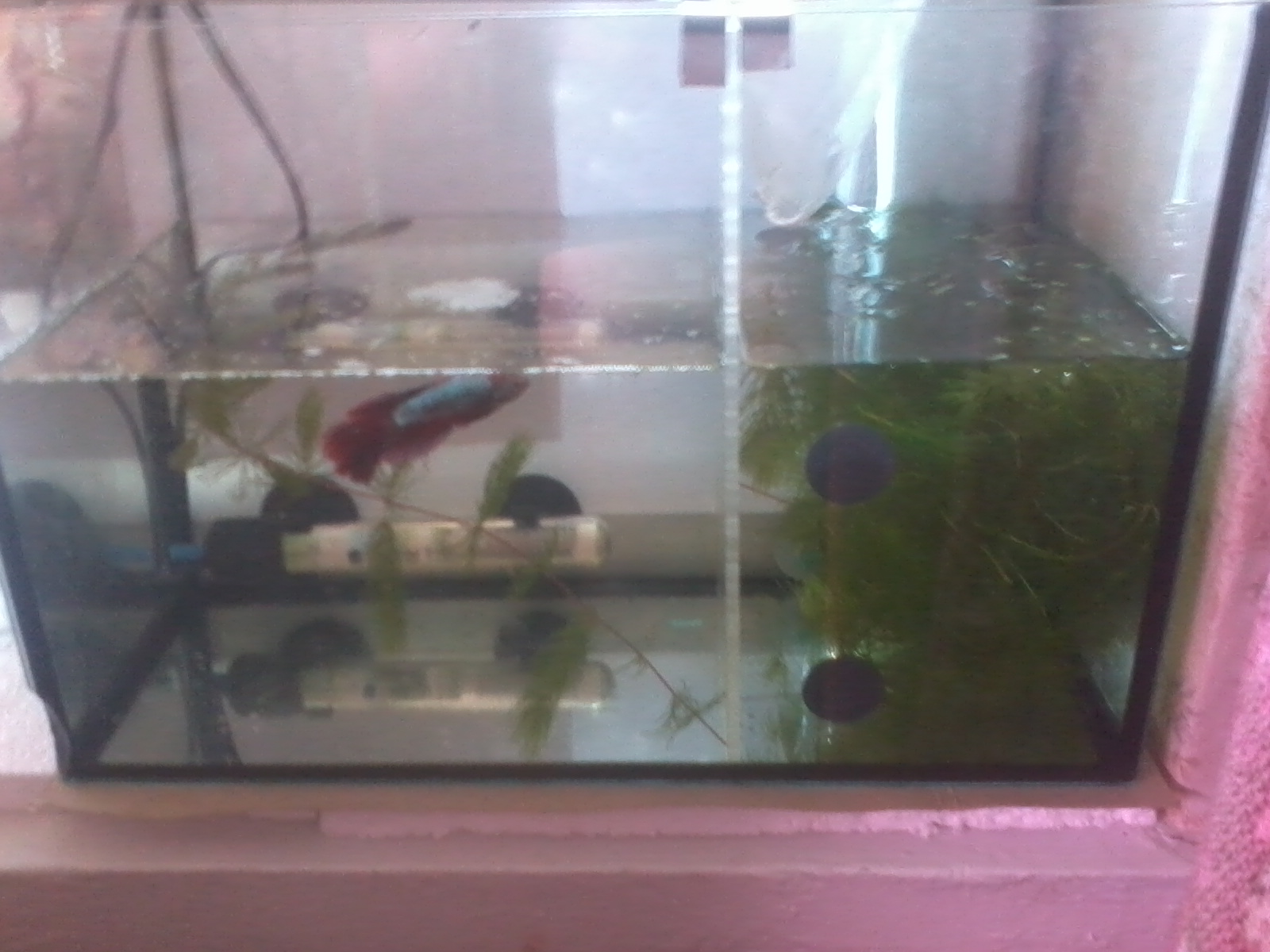 Aqvadrug, Не целесообразно делать перегородку, так как в аквариумах есть растения- элеохарис, мхи, др. Пусть живут в таком соседстве, а там видно будет. Все-таки петушки являются украшением аквариума.