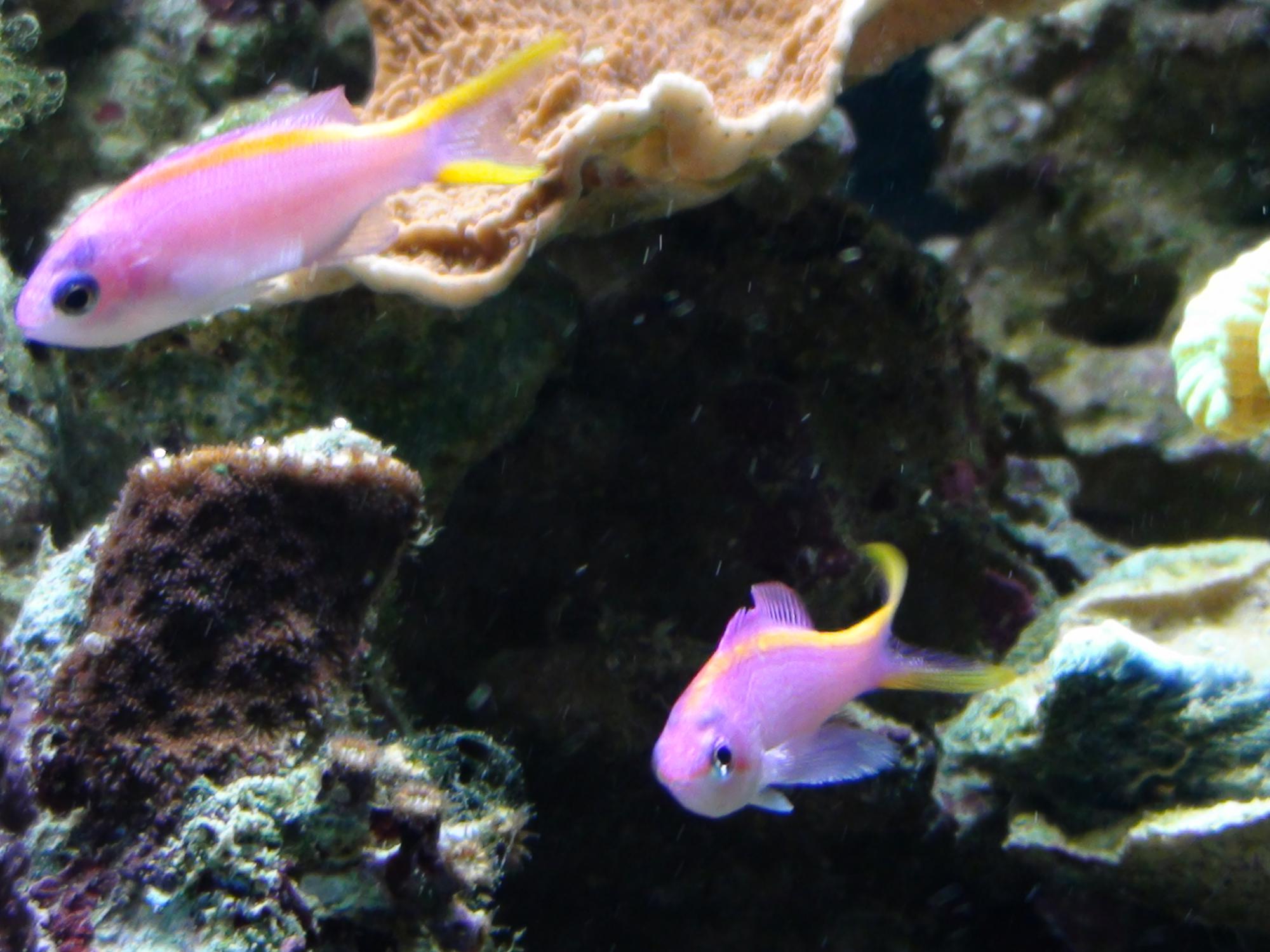 новые жильцы: стайка 5 штук Антиас королевский пурпурный (Антиас-тука) Pseudanthias (Mirolabrychthys) tuka, 1 Бабочка пинцет-хелмон (Носатый хелмон) Chelmon rostratus, 1 Бабочка вымпельная белоперая