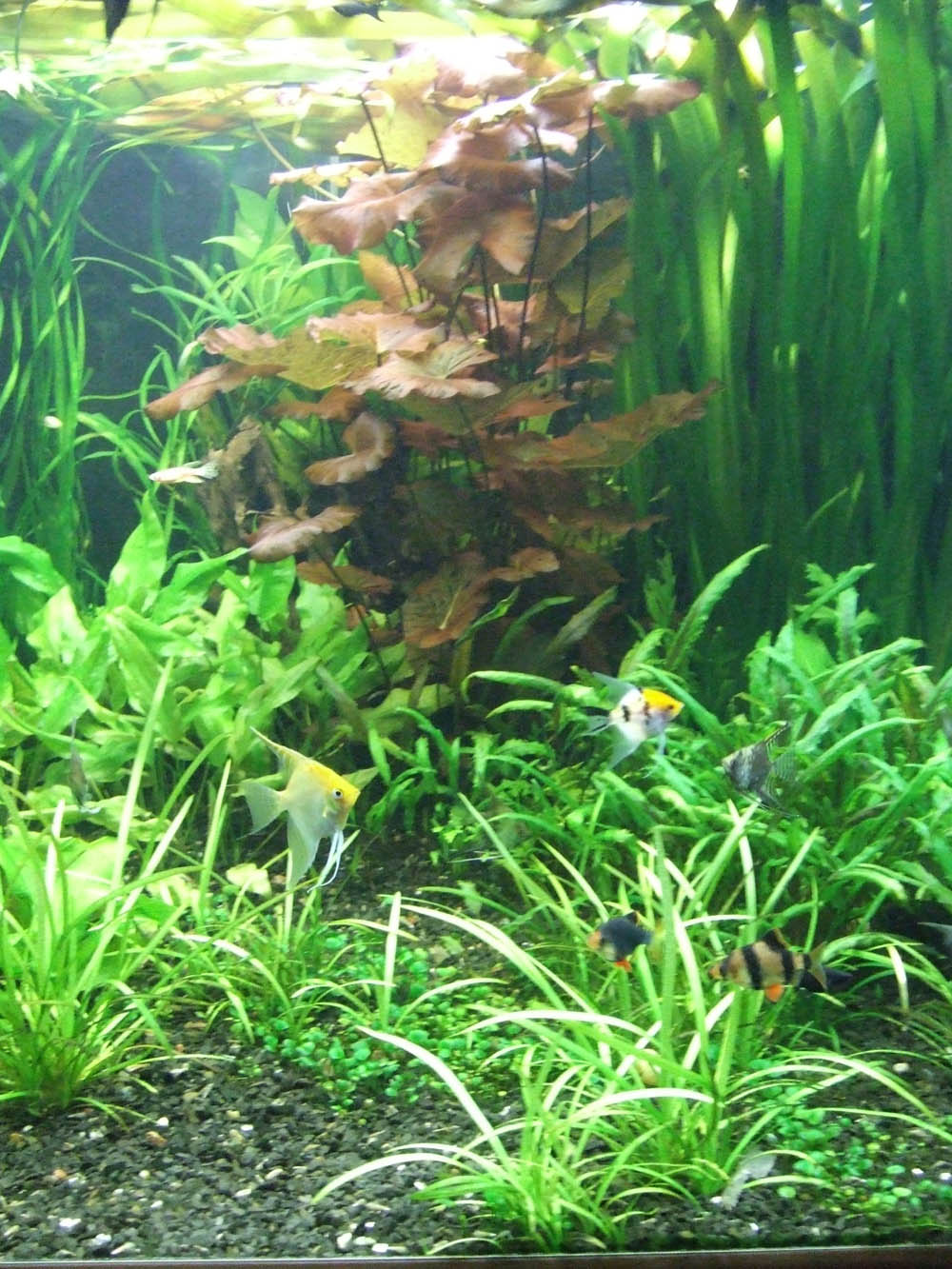 Так как перезагрузка у меня заняла почти две недели (еще и горячую воду отключили), то много растений погибло  а некоторые которые вы видите приходят в себя сейчас. Нимфея побрасывала листья, но выпустила много новых, некоторые эхи покрутили листья, но выпускают сейчас новые прямые листочки. Вобщем наращиваем сново массу растений. Рыбы так много (особенно скалярий) так как это рыба уже моего разведения, собираюсь тут на форуме раздавать/продавать.