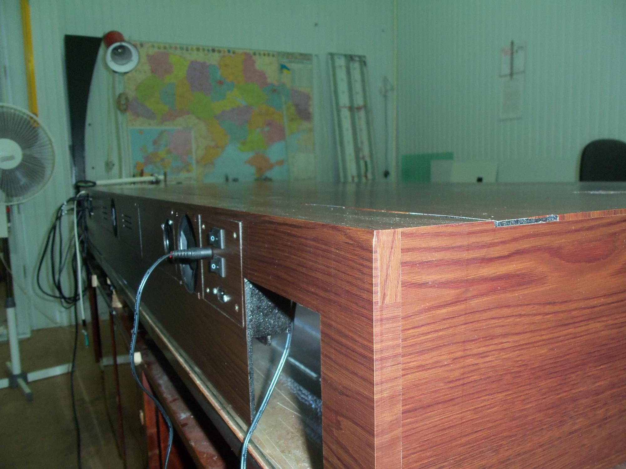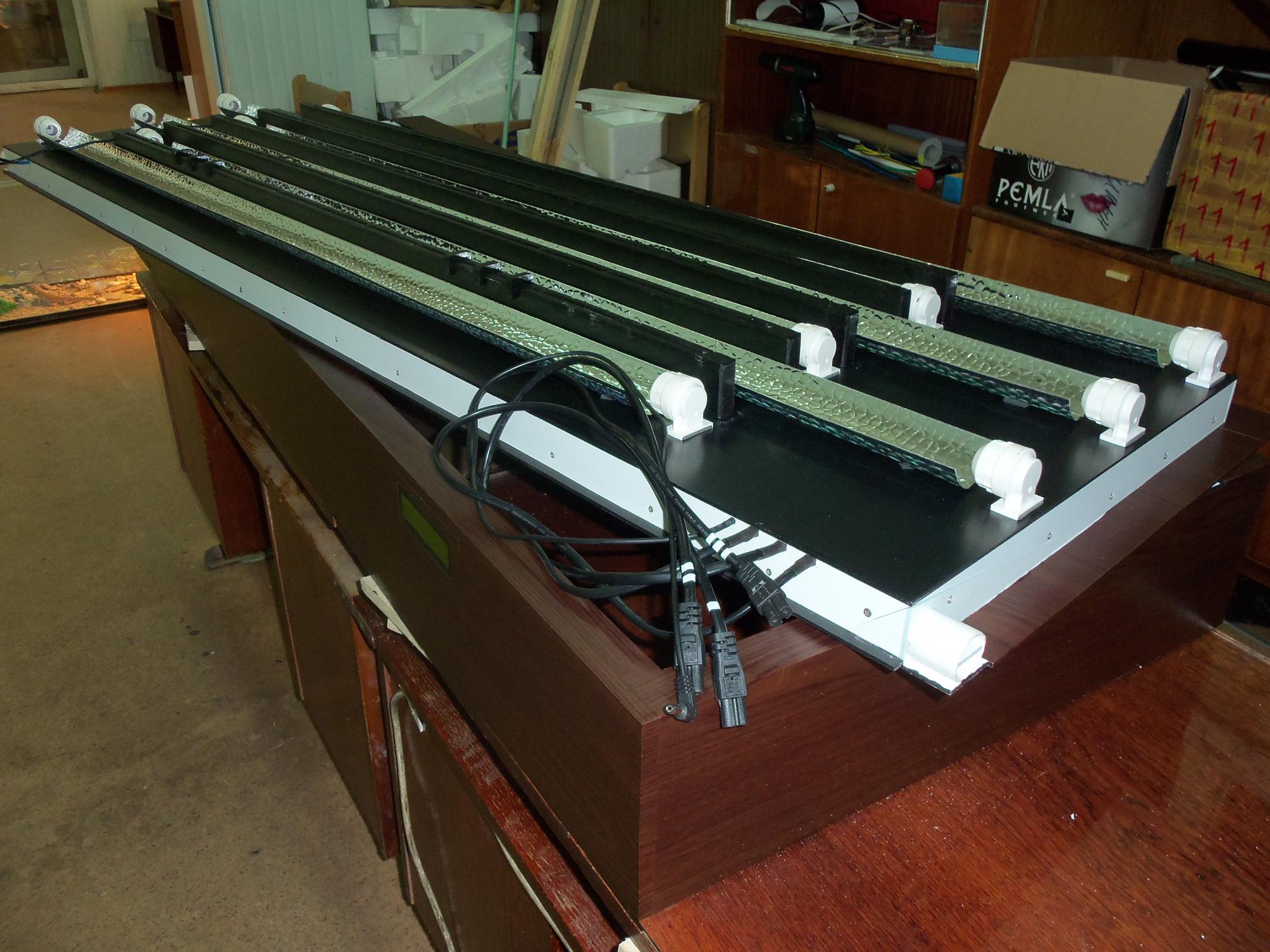 Без особых усилий подъёмный верх разъединяется на две части. Одна из них с электрической разводкой. Здесь расположены 6 ЭПРА для каждой лампы, соединённые попарно( 1-6; 2-5;3-4).ЭПРА закреплены в алюминиевых двутавровых балках с применением термопасты. Балки являются, как рёбрами жёсткости, так и великолепными радиаторами. Здесь же находятся (слева и справа) два куллера (40 мм) для охлаждения ЭПРА и по центру блок включателей (4 шт).