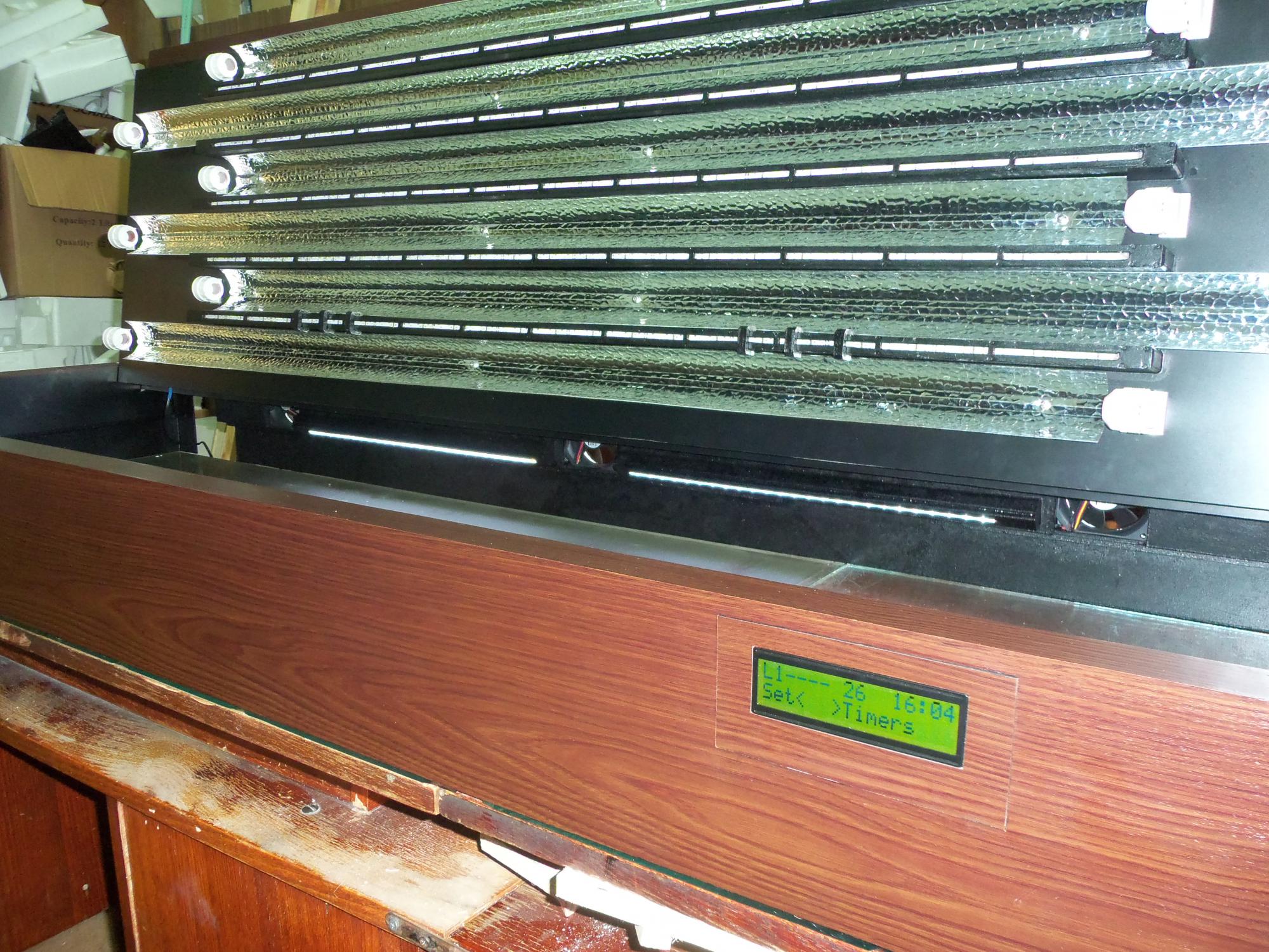 Корпус крышки одевается на аквариум , как бы «обнимая стекло» , что исключает стекание капель воды по аквариуму снаружи. На передней стенке корпуса справа встроен дисплей акваконтроллера , под ним расположены кнопки управления. Снять дисплей можно , если на внутренней поверхности передней стенки удалить две силиконовые пломбы (они в специальных выемках),вывернуть на 5-7 мм два самореза(35мм), слегка нажать на них , выдвигая дисплей, и вывернув саморезы полностью вынуть дисплей из ниши.