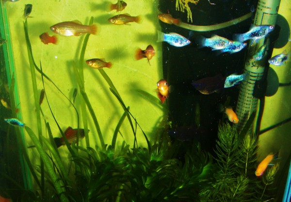 Пецилии мирные красивые рыбки. Очень не прихотливые, не каких особо усилий не требуют. Живородящие. Неоновые пецилии очень красиво смотрятся когда их несколько, не меньше 5-7 шт., плавают стайкой на свете чешуя переливаться в сине-голубой цвет, выделяются на фоне других рыбок, очень красивые