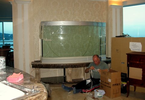 Фото 6,7. Первый в Украине цилиндрический аквариум 12т из стекла, 2005г.
