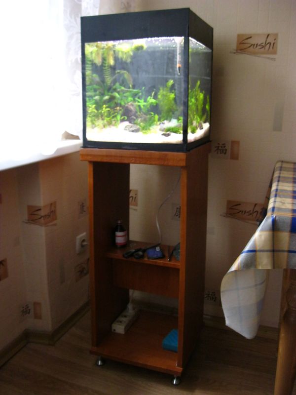 И так , аквариум готов, свет готов, тумба готова, аквариум запущен . Тумбу делал из старого ДСП.