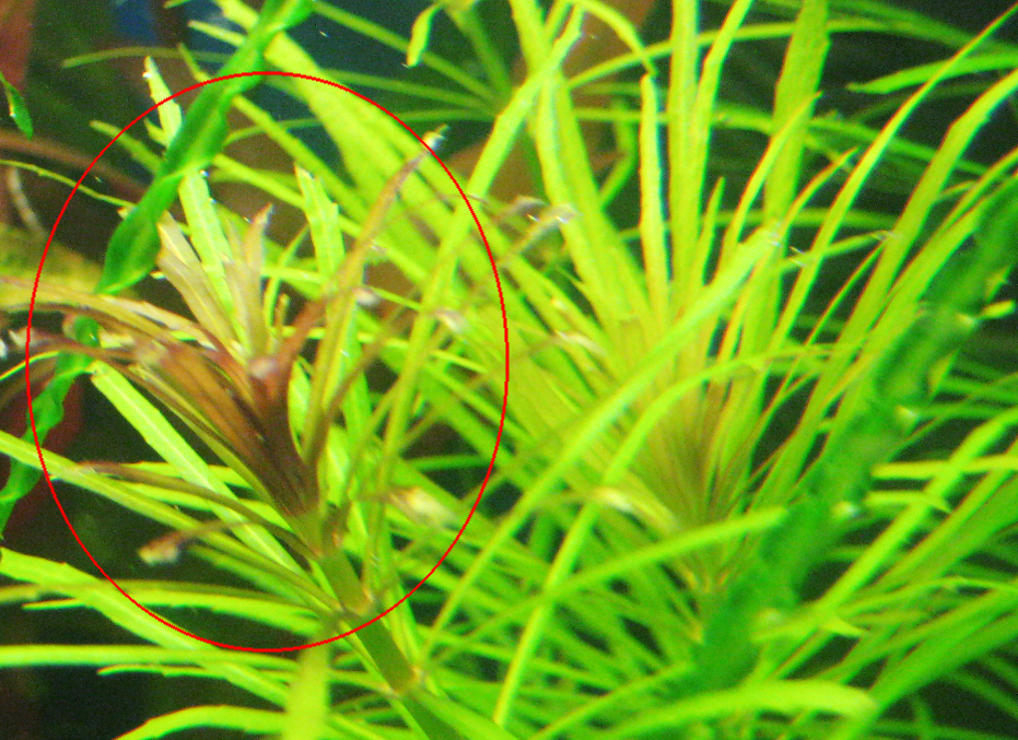 POGOSTEMON STELLATUS - у одной веточки верхушка стала красной и остановилась в росте, хотя у остальных все ок (на фото видно)