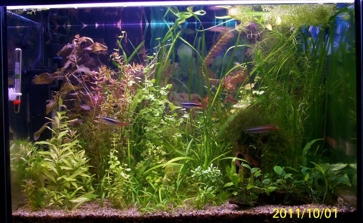 Объем воды 56 л (58*28,5*34 см). Свет: 2 лампы Aquastar * 15 Вт, стоят в шахматном порядке чтобы осветить всю длину, крышка моя. Световой день 6 + 5 часов с перерывом на 1 час (экспериментирую). Температура 26 градусов. Фильтр внутренний 200 л/ч, сопло направлено в угол, поэтому течение идет вдоль стенки. Течение не сильное, но заметное.