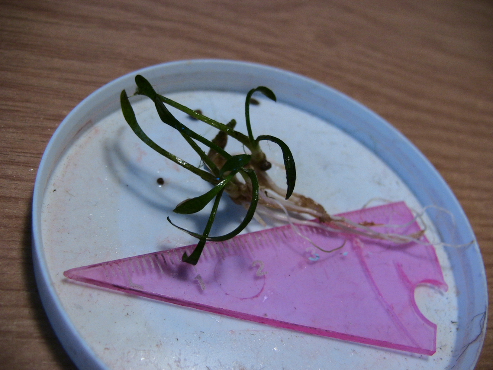 на остальных двух - неизвестное пока мне растение, которое я как-то в бонус получил от Шамана, вроде бы как зеленая альтернантера. сразу оно приживалось крайне плохо: чернело, крючилось и т.д., пока я его не пересадил в другой аквариум, с другим грунтом, подальше от глаз - авось выживет. и забыл. и вот недавно, убрав корягу, заметил какую-то незнакомую новую веточку - вспомнил