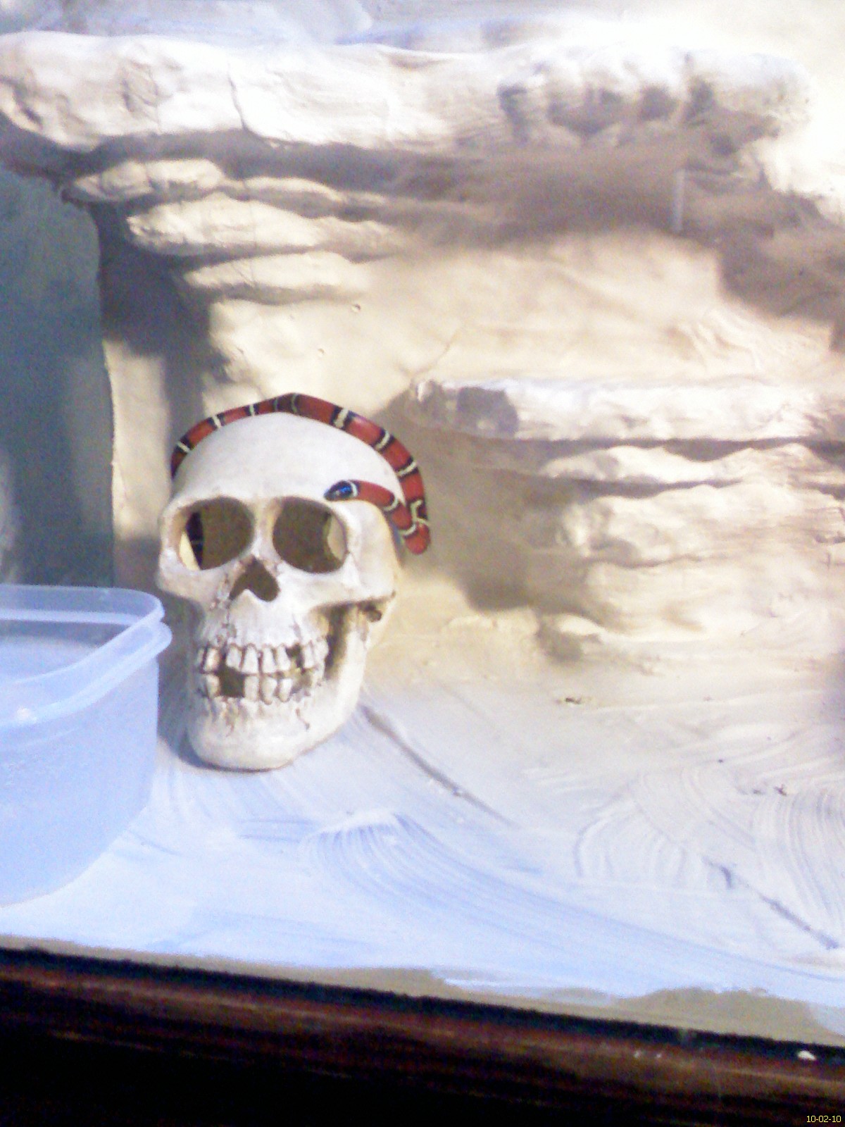 Прилепил силиконом к стеклу полки из пенопласта. Залил всё алебастром. Алебастр выбрал - т.к. быстро. На этом - первый этап окончен. Далее придумаю чего бы ещё туда влепить в плане рельефа (может арку сделать или скал пару посреди терра). Придумаю куда водоём влепить и в какой оттенок всё это облачить. Намерен насыпать слой песка (жёлтого или светло-жёлтого) и покрыть смесью песка с эпоксидкой? (с чем мешать ещё не решил) . Посадить немного растючки пустынной.