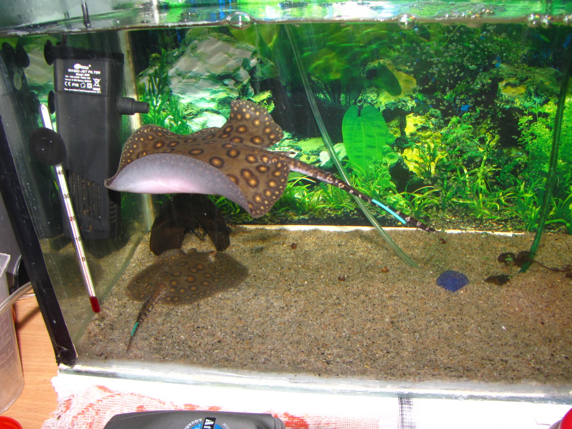 кстати сначала когда освобождала акву под скатов пока засыхал силикон на той что потекла, то мне было некуда пристроить одного приболевшего йодотрофеуса, ну я взяла и кинула его к скатам, подумав ну что там может случится или сдохнет совсем или подлечится вместе с ними... но эта неблагодарная свинка сразу же только попала в акву подплыла к хвосту ската и видимо собиралась его цапнуть, я тут же сачек обратно и йодика вон из аквы.. хотя до этого йодик сидел с дельфином который 2 см размером и дельфин его гонял. Вот так вот..