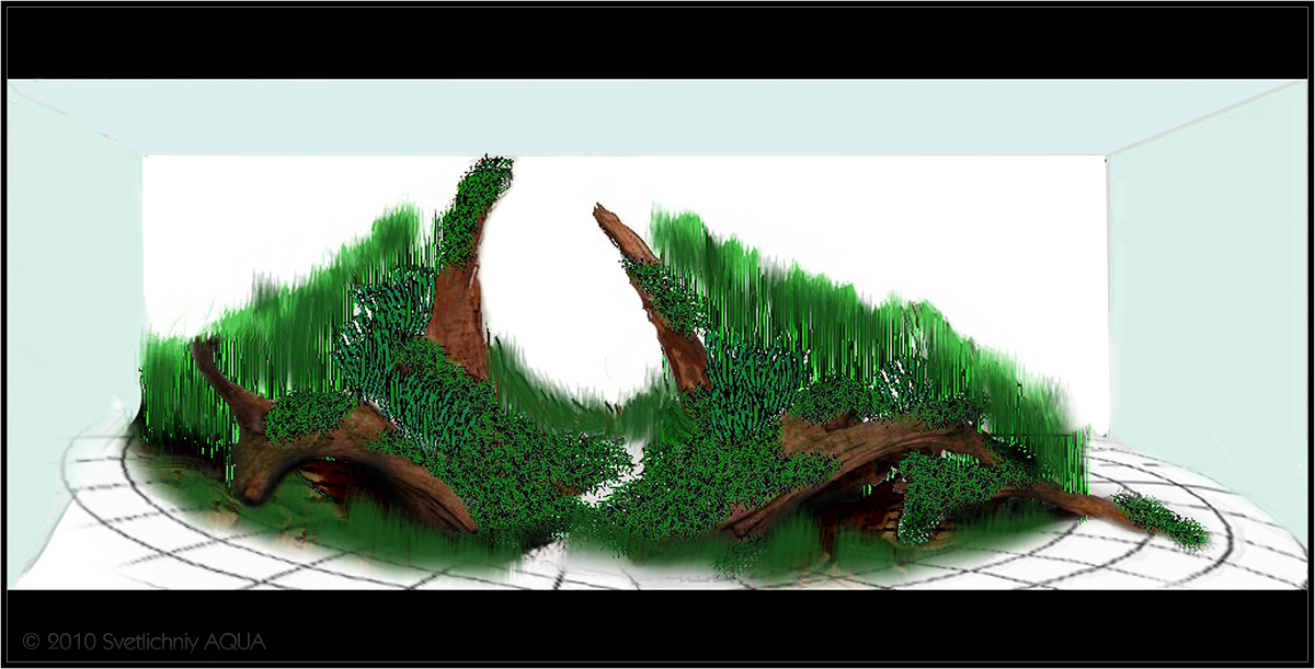 Rustle shadows - это попытка воспроизвести остров с девственной природой, тропы которого протоптаны возможно дикими животными, но не человеком! Остров, на котором каждый из нас хотя бы раз в жизни мечтал оказаться. Остров, который манит и в тоже время настораживает. Поэтому и коряги я расставил в форме рук - слева с открытой ладонью - символизирует приглашение, справа - с поднятым вверх указательным пальцем - как бы предостережение... Это хорошо видно на эскизе.