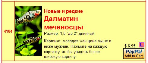 Вечная диллема между разводчиками и покупателями - сколько должен стоить , скажем, один меченосец ? Сноски из штатовского сайта по продаже рыбы. Внизу справа - цена . Взрослая рыба значительно дороже /3-е фото - внизу/. Хотя , справедливости ради , можно сказать о разнице в уровне жизни , и наверное зарплате . Мой дедушка , разводивший меченосцев говорил : ...Один хороший меченосец должен стоить , как одна селедка .