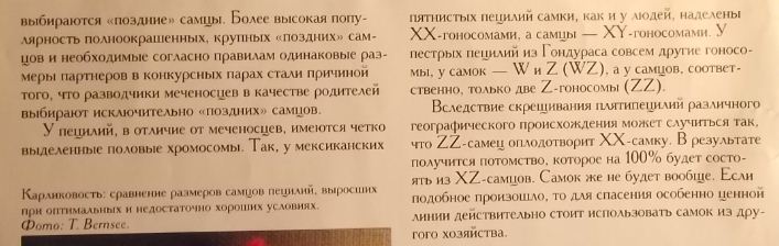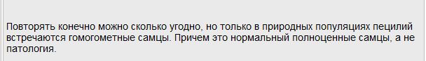 Я смотрю Вы бедного Сторожева на Клубе Гуппи тоже заколебали . Есть ли у мечей гонасомы или нет. Если надо я забугорную сноску приведу. А насчет получения в помете только самцов попробую чтоб дошло на пецилиях пояснить . У Мексиканских пятнистых пецилий самки ХХ , а самцы ХУ. У пестрой пецилии из Гондураса - другие гонасомы . У самок - W и Z , у самцов , соответственно , только две ZZ- гонасомы. В следствие скрещивания пецилий различного географического происхождения может случится так , ZZ - самец оплодотворит ХХ самку. В результате получится потомство , которое на 100% будет состоять из ХZ - самцов. Самок не будет вообще. Если поняли поясните?
